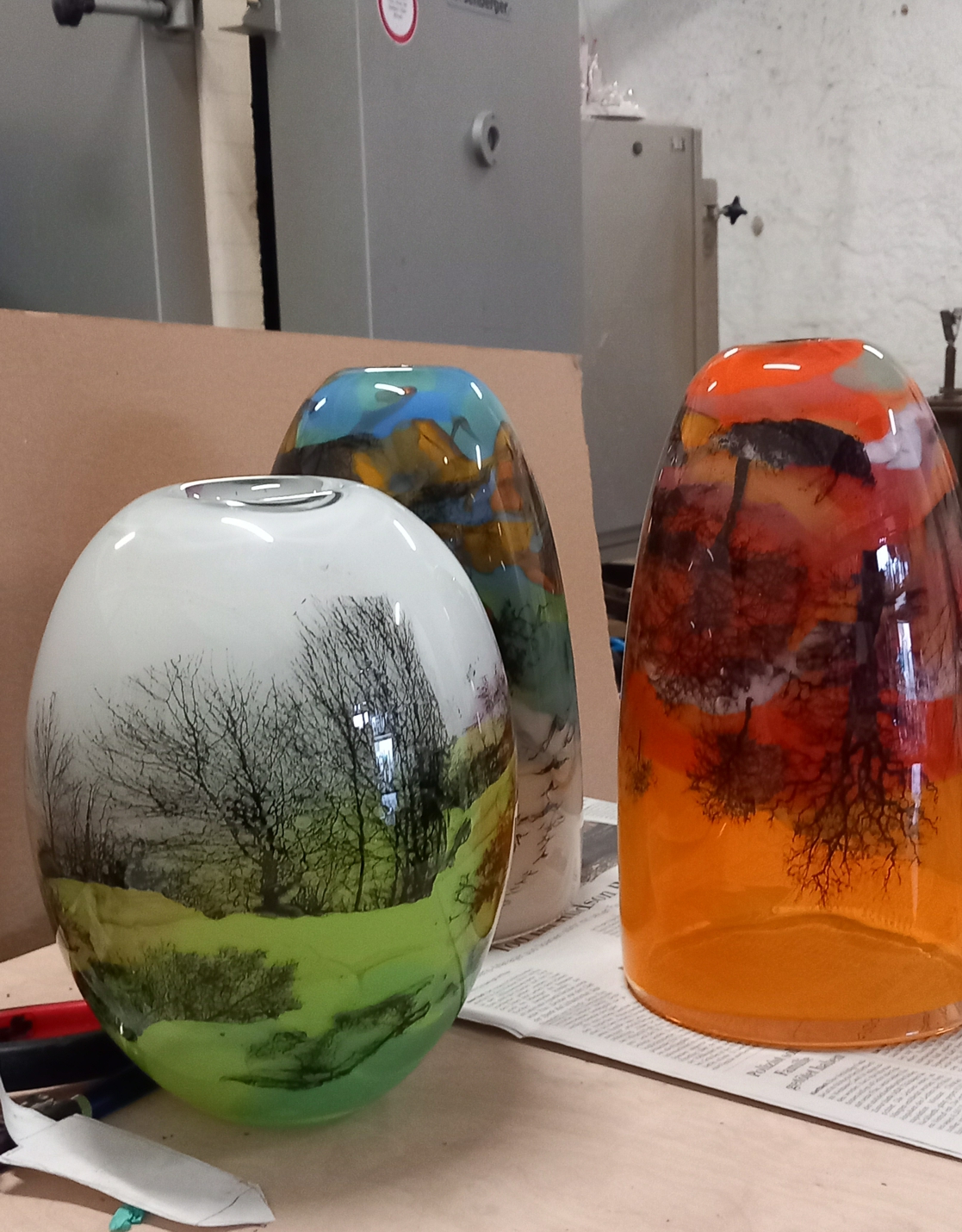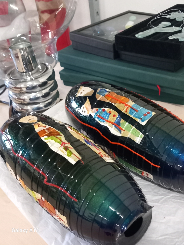 Es entstanden neben unseren Landschaften experimentelle Objekte, die weiterentwickelt werden sollen. Witzige, hohlgeblasene Gefäße und quaderförmige Vollglasteile mit Innenleben, welches nur durch eine Irisschicht zum Vorschein kommt.