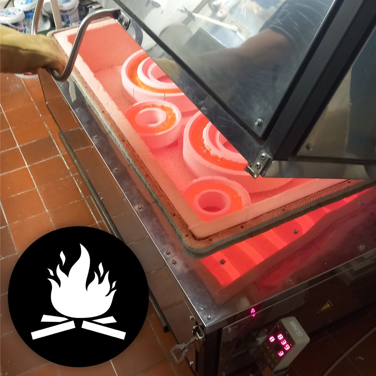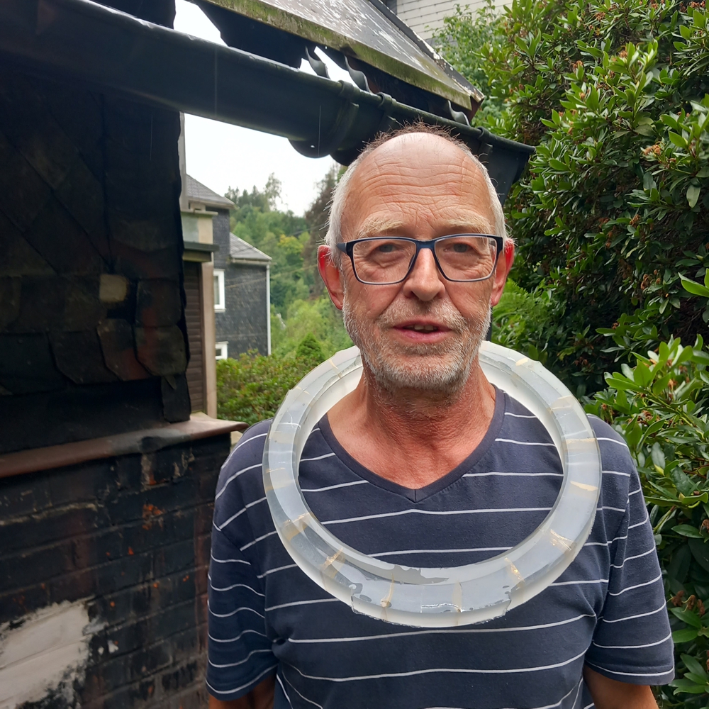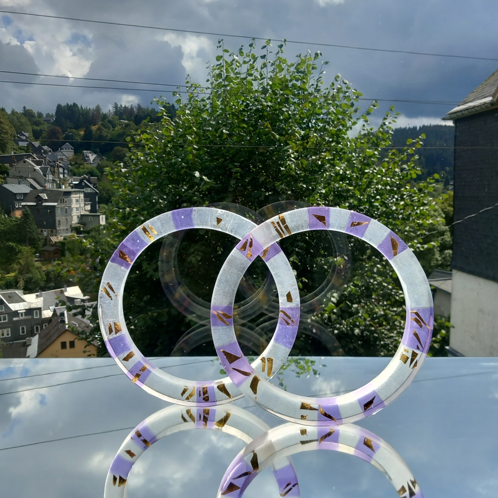 Mein Bruder kündigte im Herbst 2022 seine Hochzeit an. Wir waren wie elektrisiert. Unsere letzte Familienhochzeit war unsere eigene 1980. Es entbrannte bei uns ein heftiger Wettstreit um die beste Idee für das Hochzeitsgeschenk. Alle Familienmitglieder waren beteiligt. Es muss aus Glas sein- natürlich Ringe !! Wie groß und in welcher Technik ? Es hatte jeder seine eigenen Vorstellungen. Jedenfalls ist es uns gelungen in nur drei Wochen ein neues Verfahren zu entwickeln, mit neuem Glas, neuen Formen usw. Am längsten hat das Trocknen der Formen gedauert.